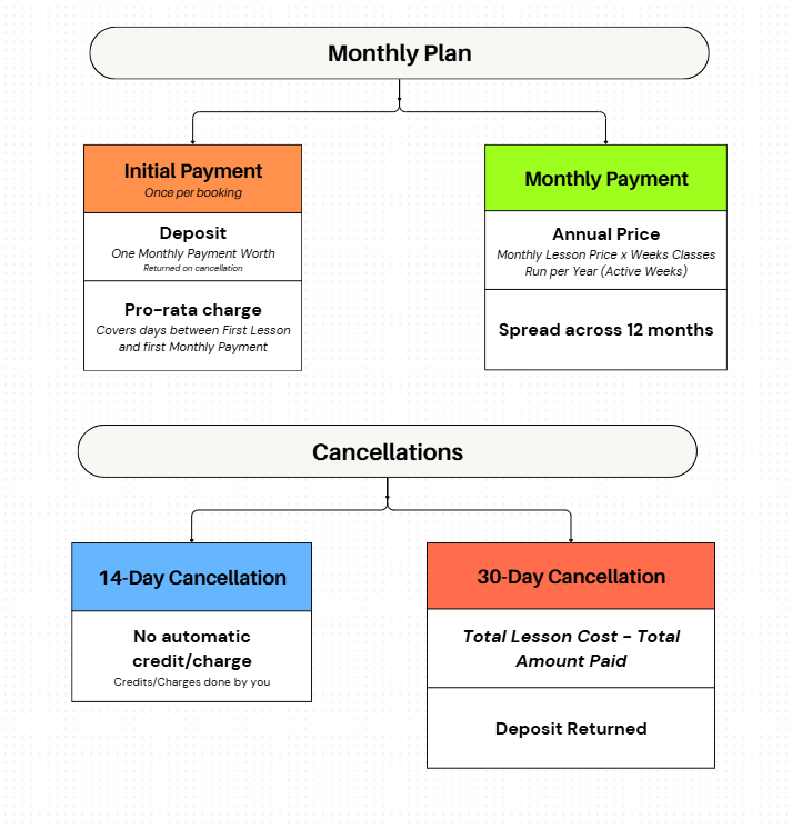 Note: Monthly payments run continuously throughout the year. They represent the total cost of all lessons for the year spread across 12 months, rather than dividing just the cost of a single term into 3 payments, for example.
